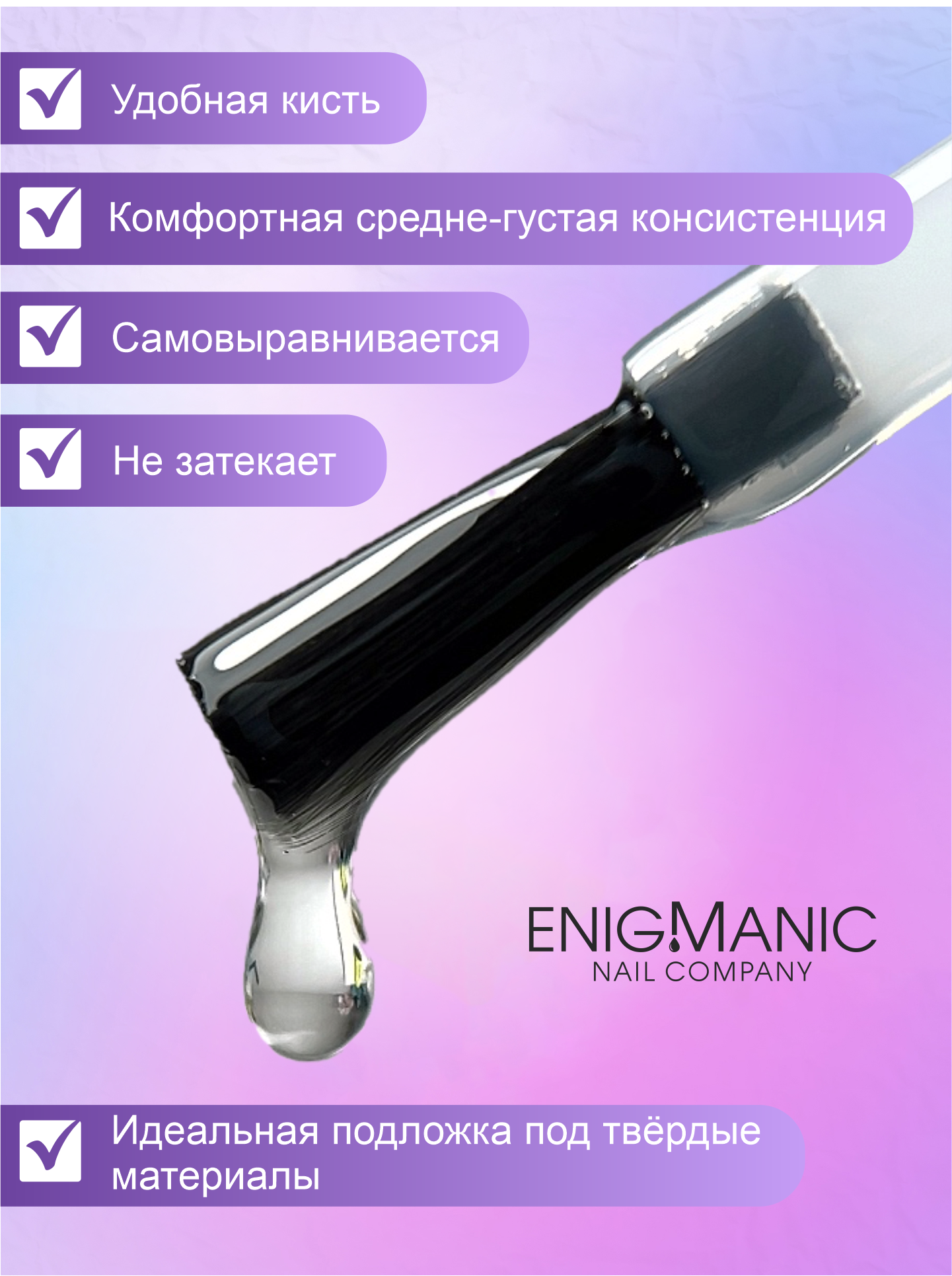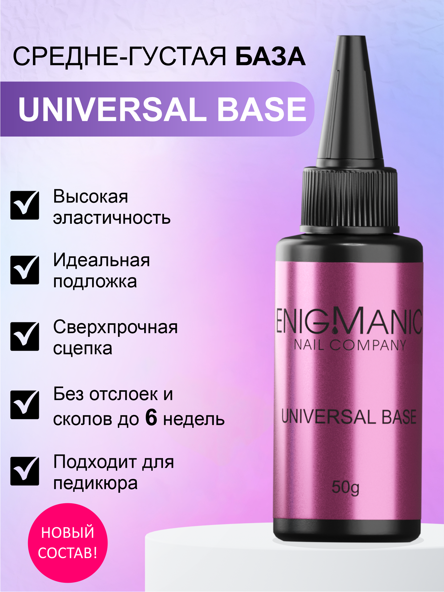 Universal rubber base oт ENIGMANIC - это универсальная высокоэластичная база средней кислотности, имеет улучшенную формулу. UNIVERSAL BASE не скалывается и не отслаивается, база средне-жидкой консистенции, (ВНИМАНИЕ! База теперь немного гуще, прежнего состава), благодаря которой ноготь остаётся подвижным и не скручивается. Подходит для всех типов ногтей, для выравнивания и укрепления любой формы и длины.