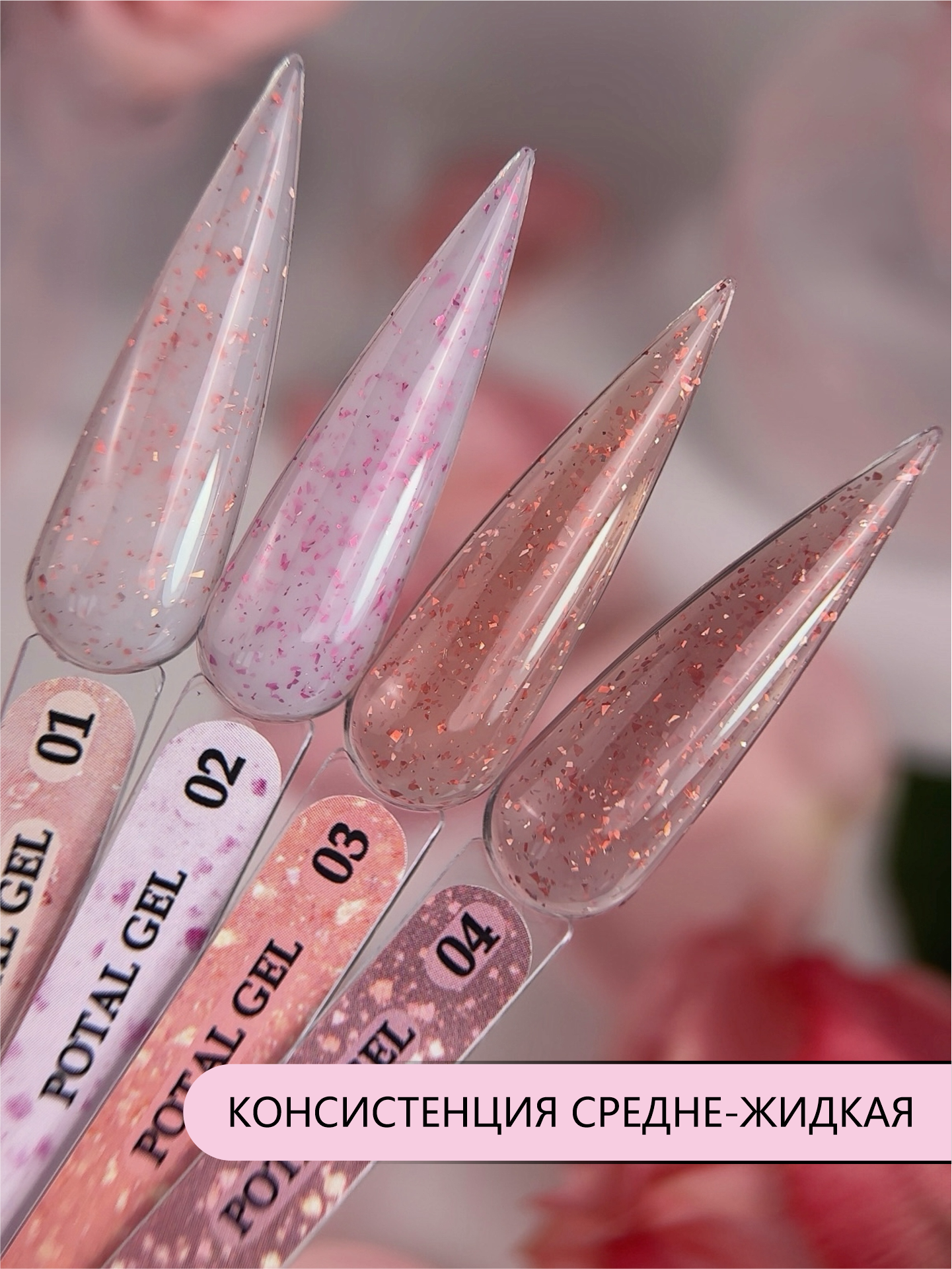 Коллекция гелей с поталью 4 оттенка, с молочной и нюдовой основой и декоративной поталью, создают эффект глубины.