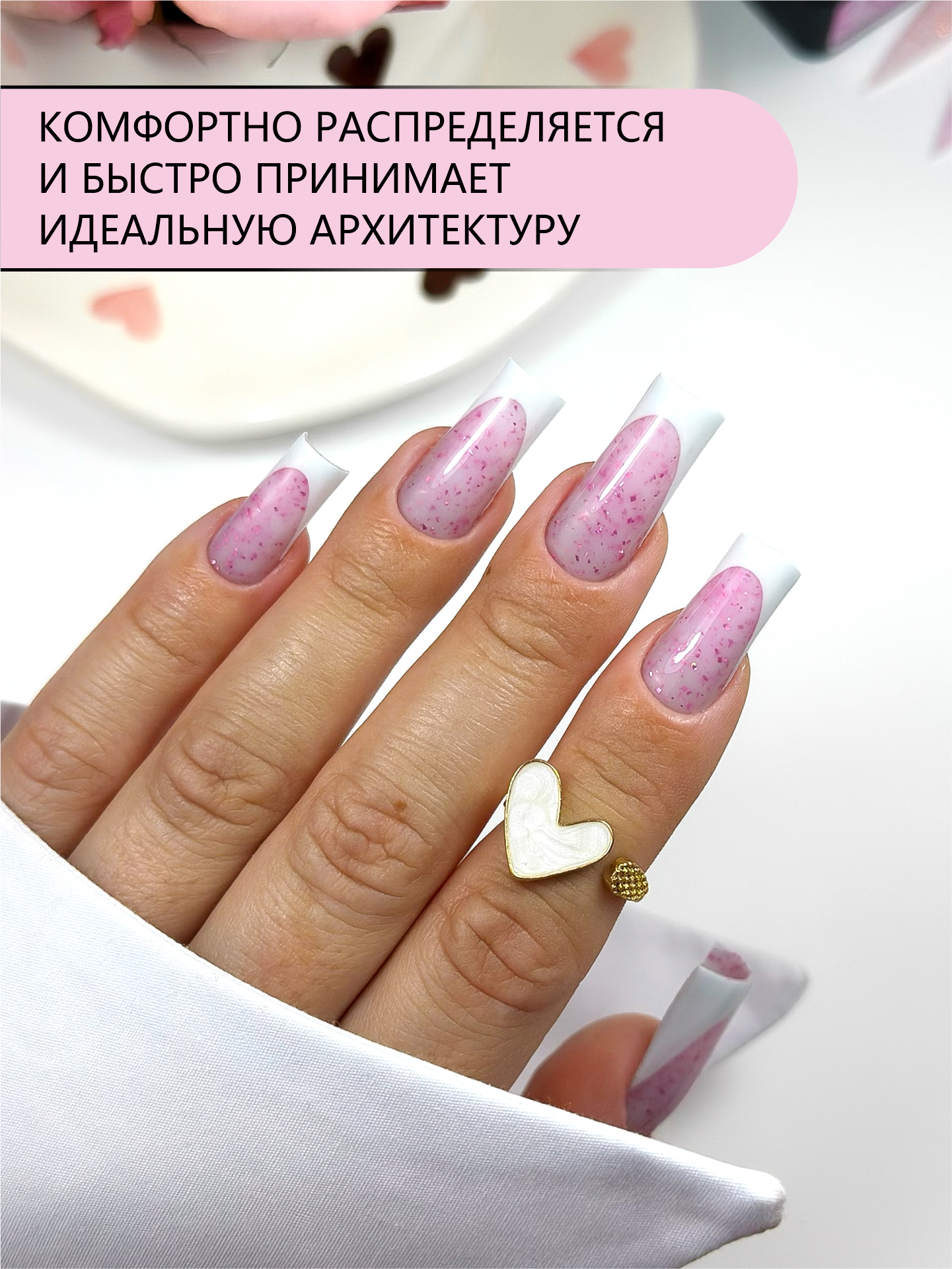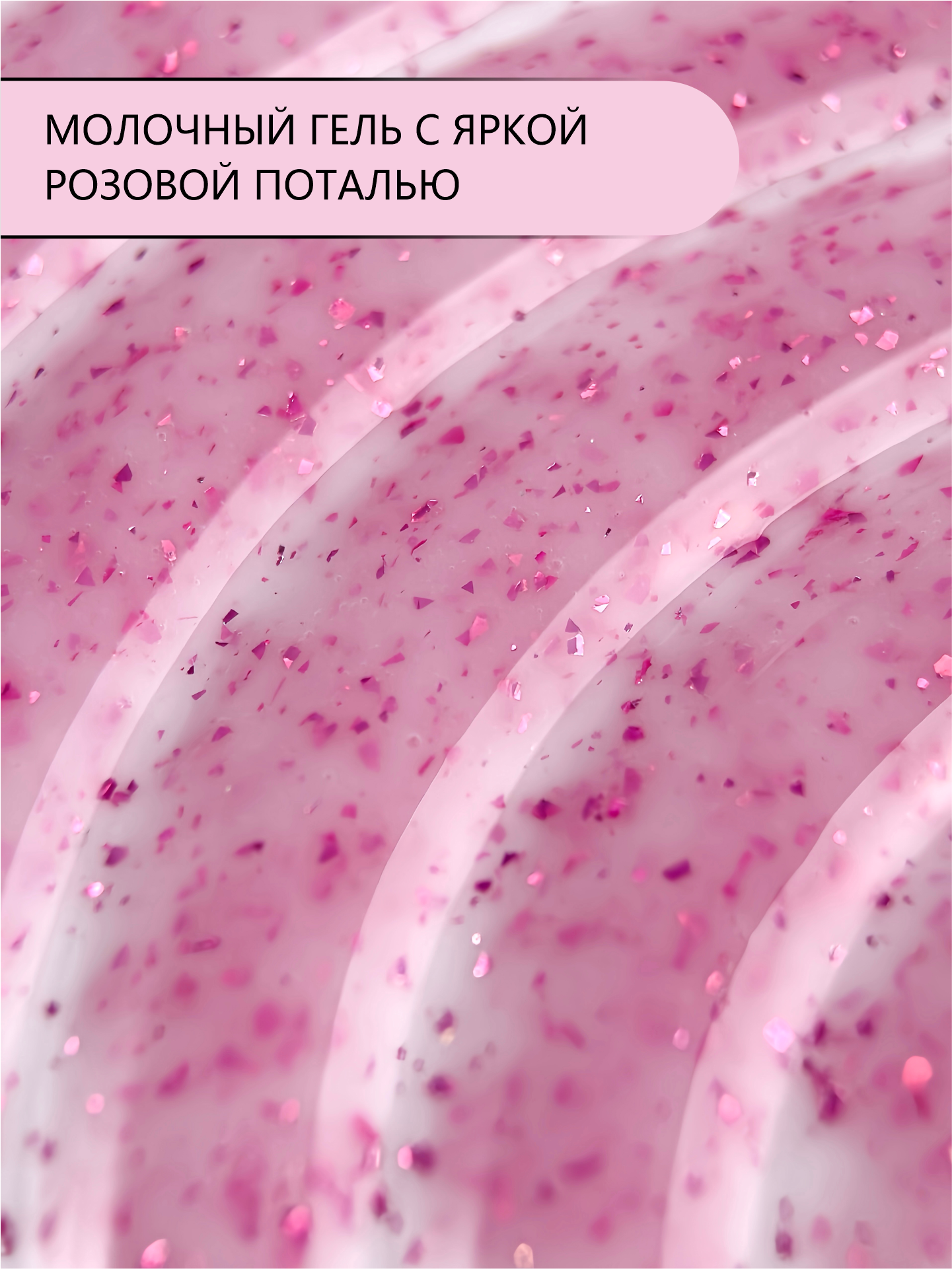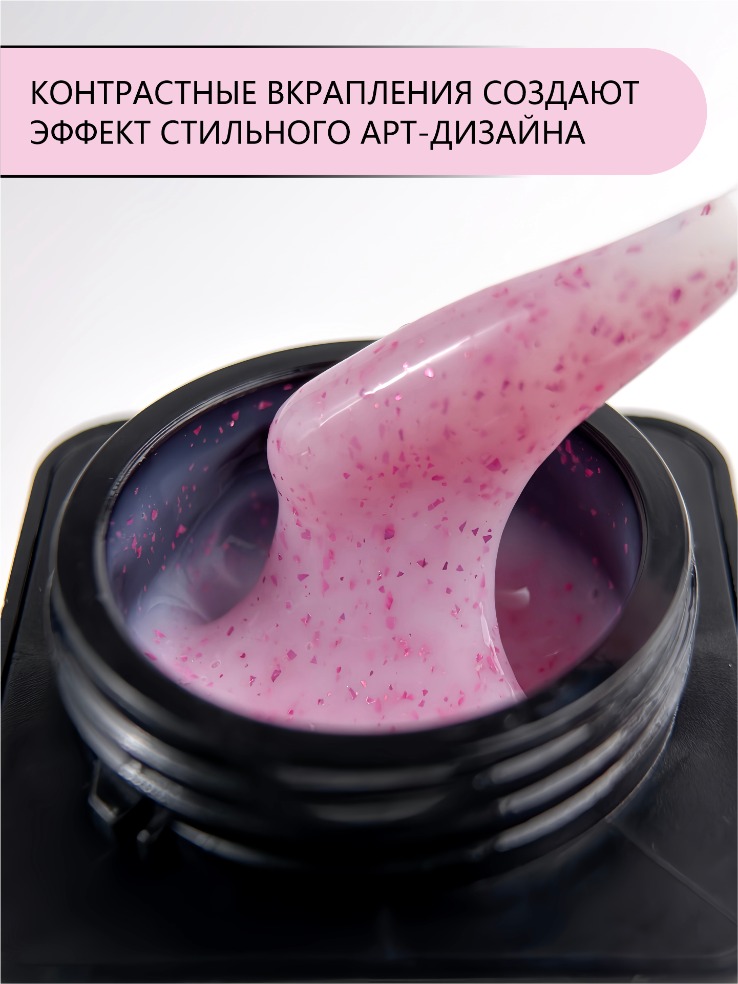• молочный гель с яркой розовой поталью. Контрастные вкрапления создают эффект стильного арт-дизайна.