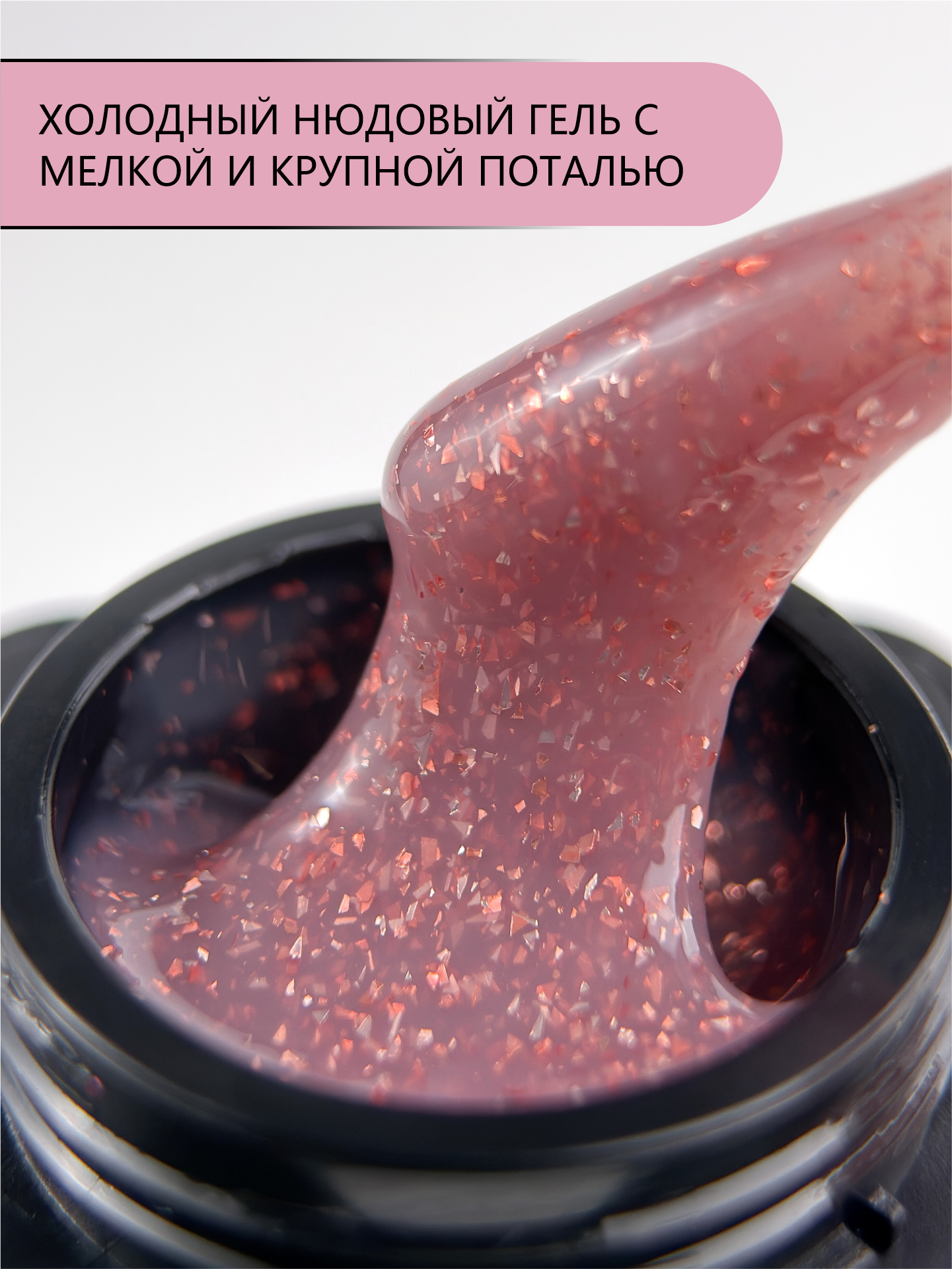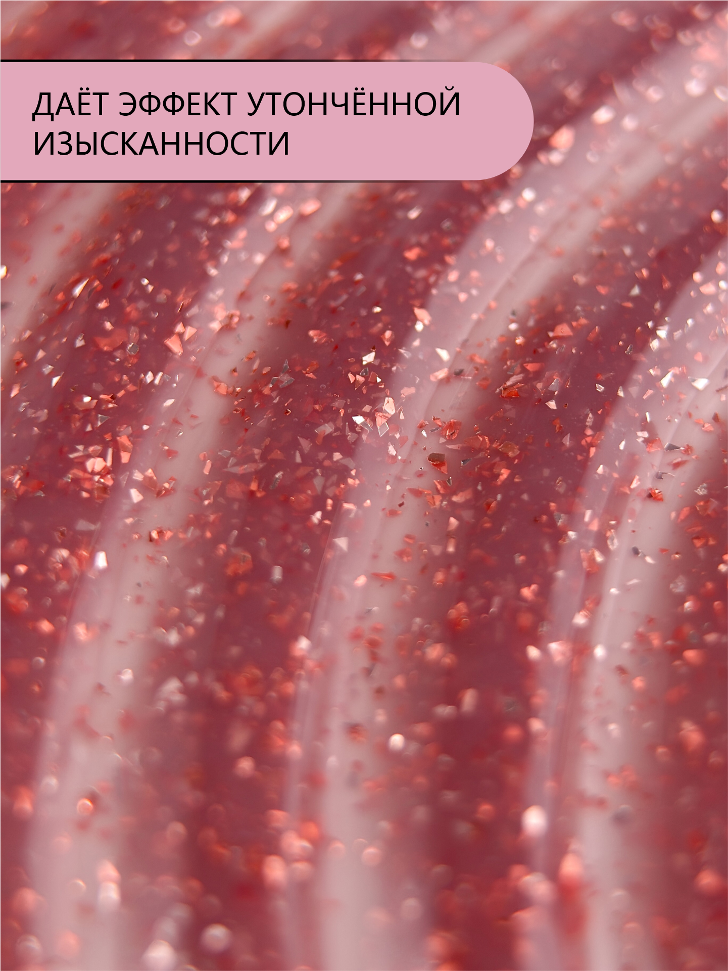 • тёплый нюдовый гель, наполнен мерцающими частицами медной потали. Смотрится богато, как деликатный намек на роскошь.