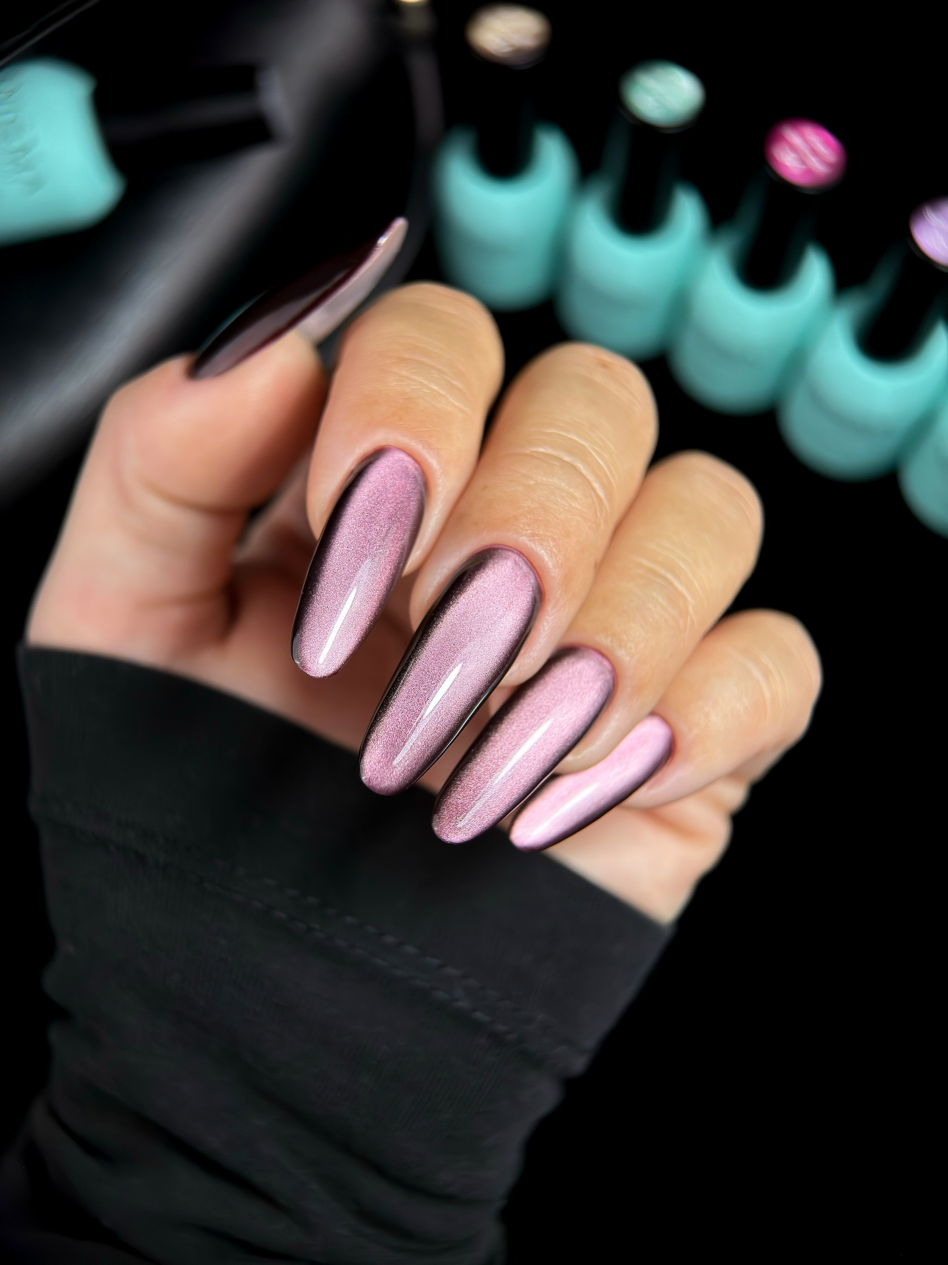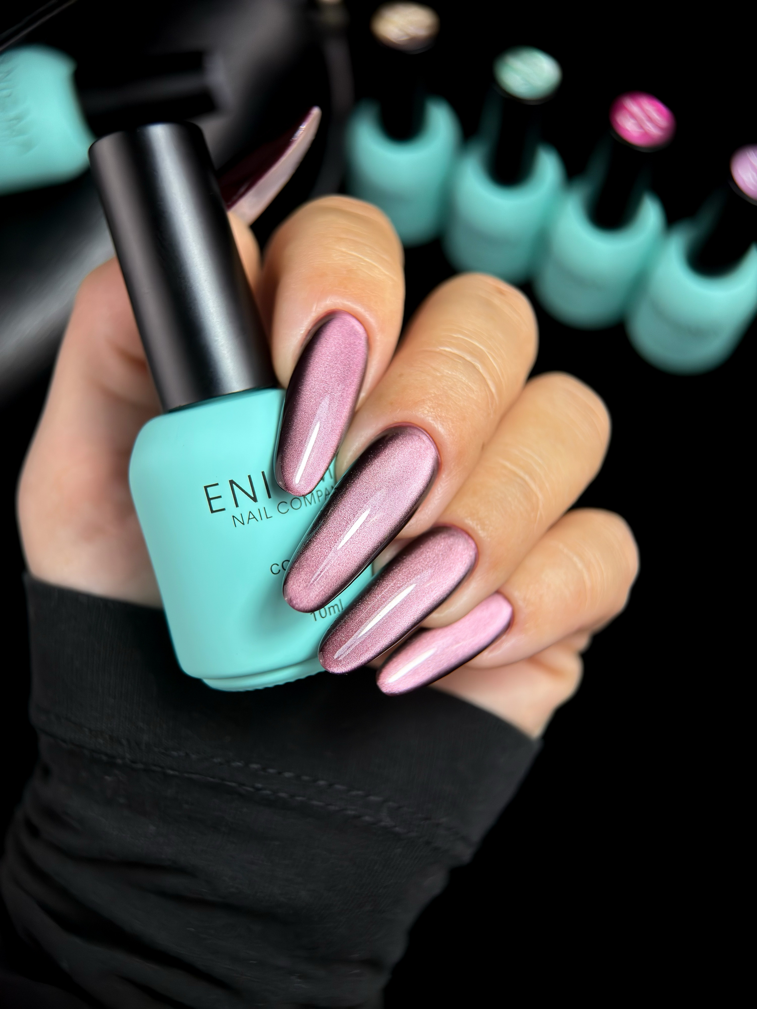 Шесть оттенков, каждый со своим характером: от холодного дымчато-стального до теплого нежно-розового. Это не просто кошачий глаз - это эффект парящего блика, который скользит по ногтю, как луч по гладкому шелку.
