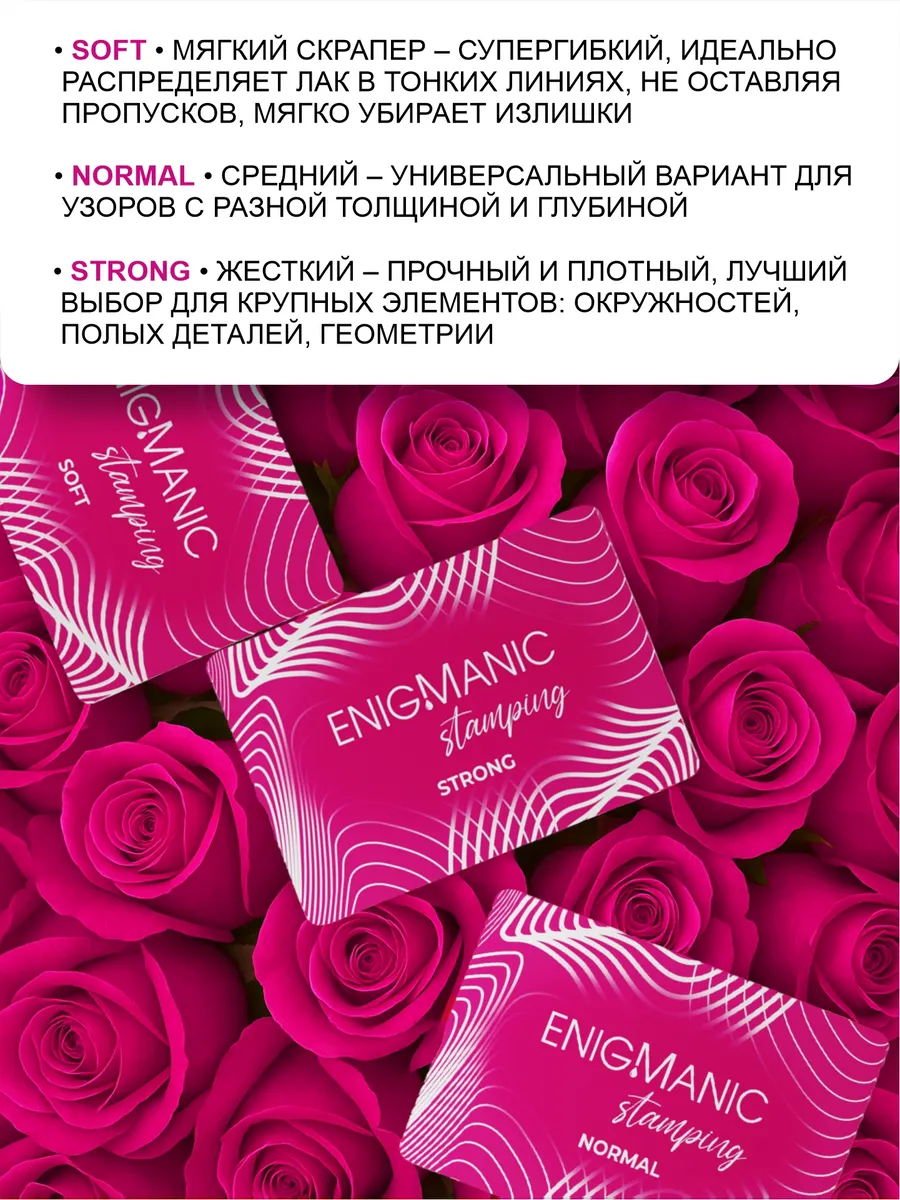 В комплект входят три скребка разной жесткости, и именно это позволяет идеально подобрать инструмент под каждый рисунок и любой материал – от лаков для стемпинга, сохнущих на воздухе, до гелей для стемпинга