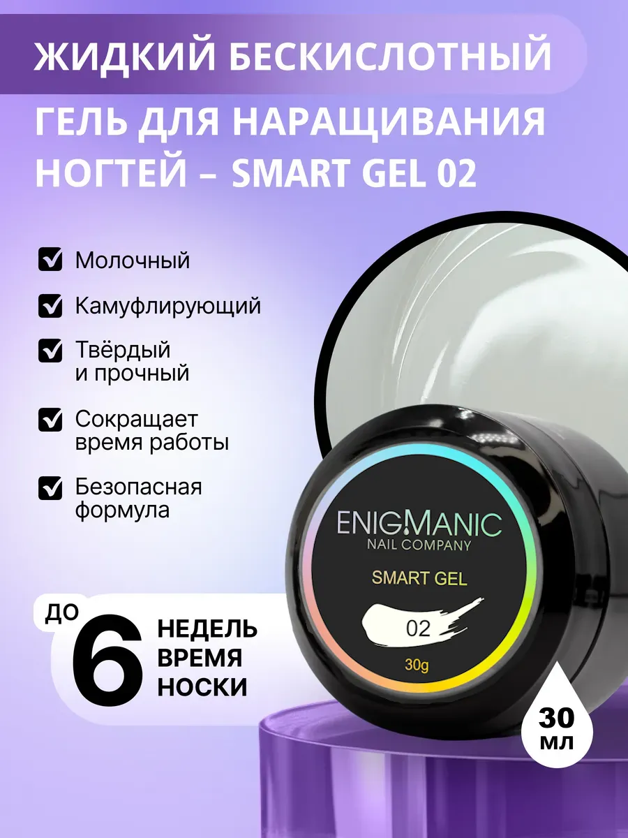 Enigma SMART Liquid gel-абсолютно безопасный, быстрый, комфортный, бескислотный жидкий гель. Он сочетает в себе твёрдость и прочность как у геля и лёгкость нанесения как у базы.
