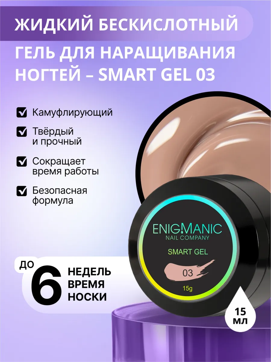 Enigma SMART Liquid gel-абсолютно безопасный, быстрый, комфортный, бескислотный жидкий гель. Он сочетает в себе твёрдость и прочность как у геля и лёгкость нанесения как у базы.