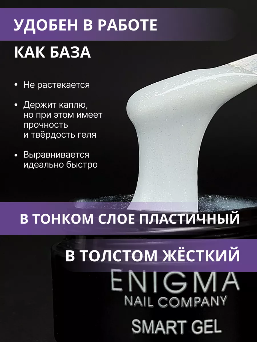 Enigma SMART Liquid gel-абсолютно безопасный, быстрый, комфортный, бескислотный жидкий гель. Он сочетает в себе твёрдость и прочность как у геля и лёгкость нанесения как у базы.