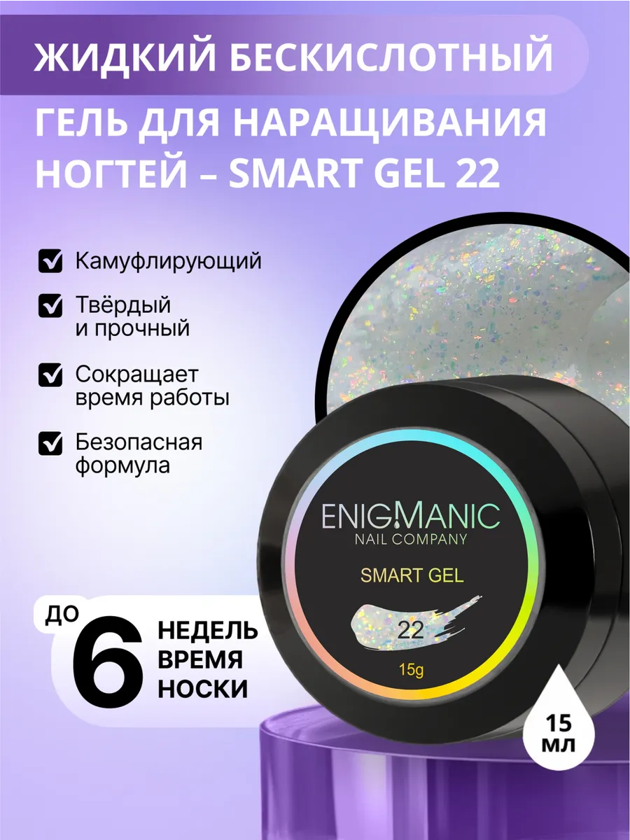 Enigma SMART Liquid gel-абсолютно безопасный, быстрый, комфортный, бескислотный жидкий гель. Он сочетает в себе твёрдость и прочность как у геля и лёгкость нанесения как у базы.
