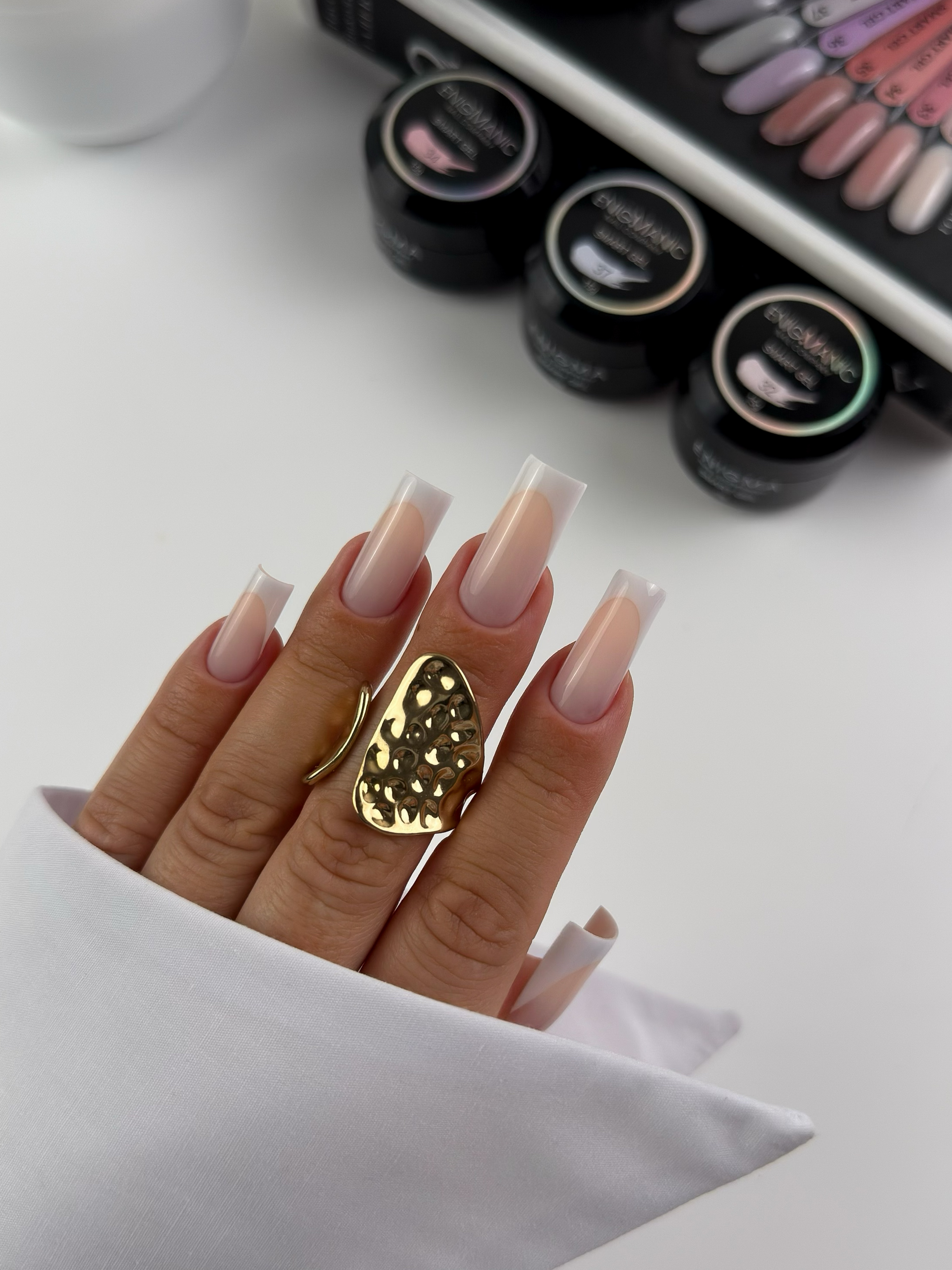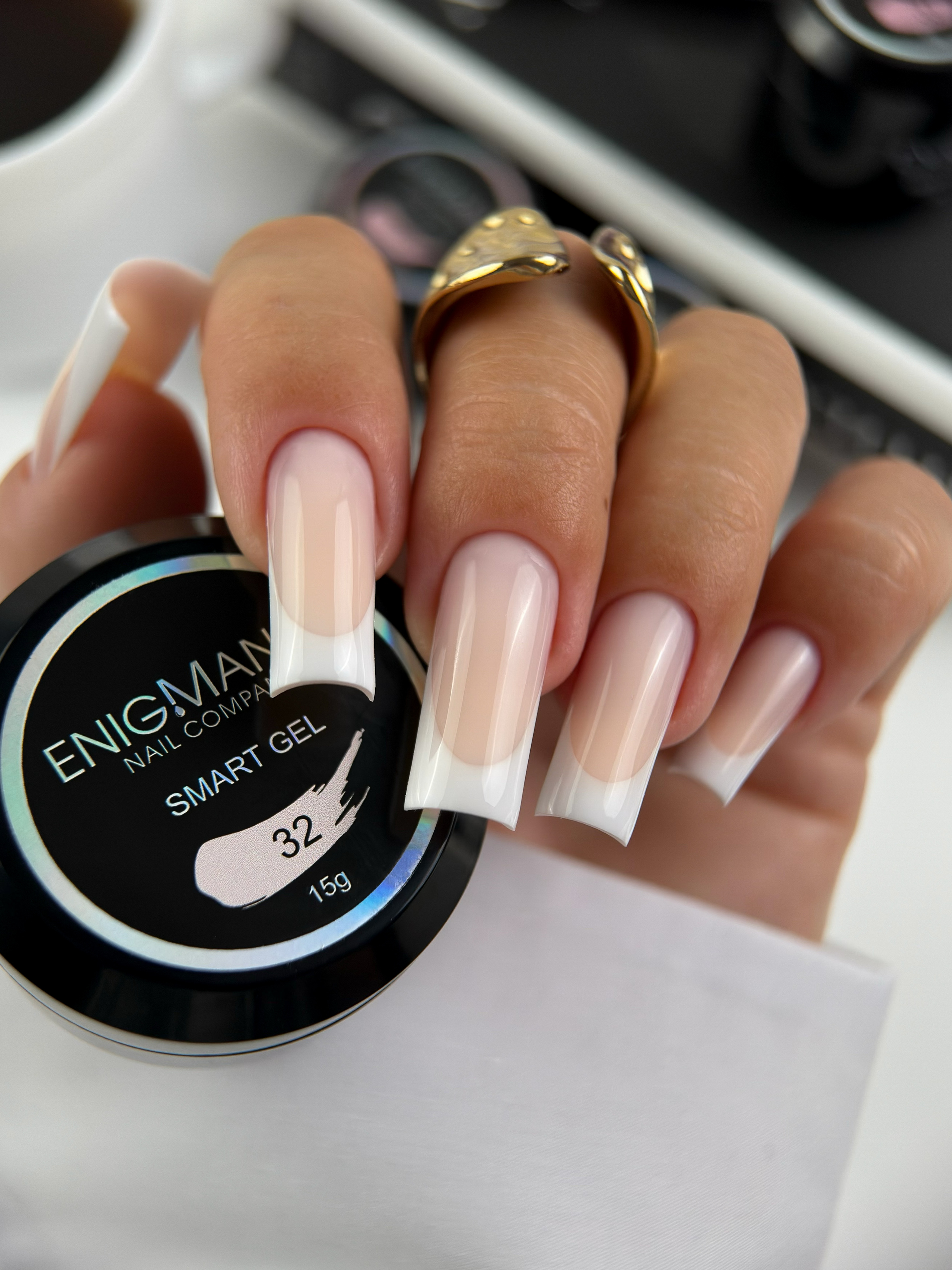 Enigma SMART Liquid gel-абсолютно безопасный, быстрый, комфортный, бескислотный жидкий гель. Он сочетает в себе твёрдость и прочность как у геля и лёгкость нанесения как у базы.