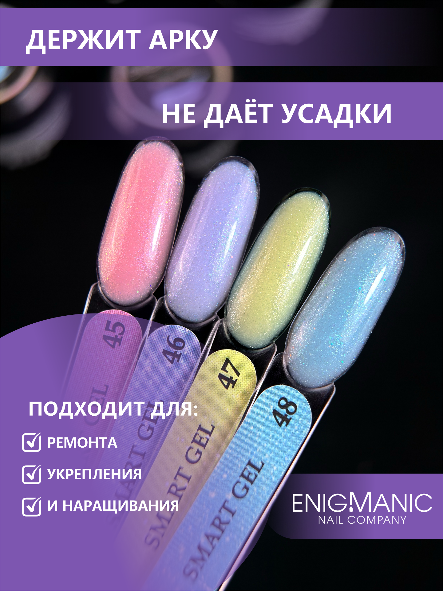 Enigmanic SMART Liquid gel-абсолютно безопасный, быстрый, комфортный, бескислотный жидкий гель. Он сочетает в себе твёрдость и прочность как у геля и лёгкость нанесения как у базы.